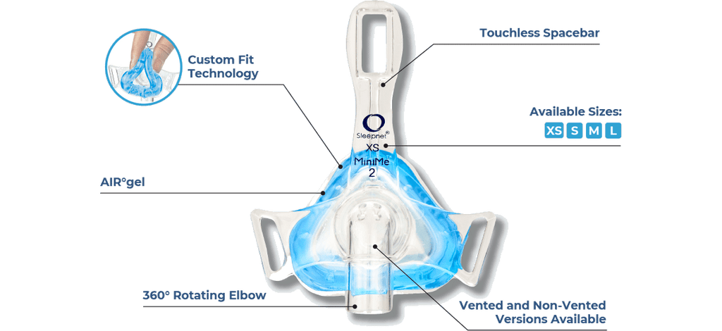 The MiniMe®2 Nasal Pediatric Mask uses Sleepnet’s AIR°gel® cushion featuring Custom Fit Technology, which provides superior stability and a comfortable seal while minimizing skin irritation.